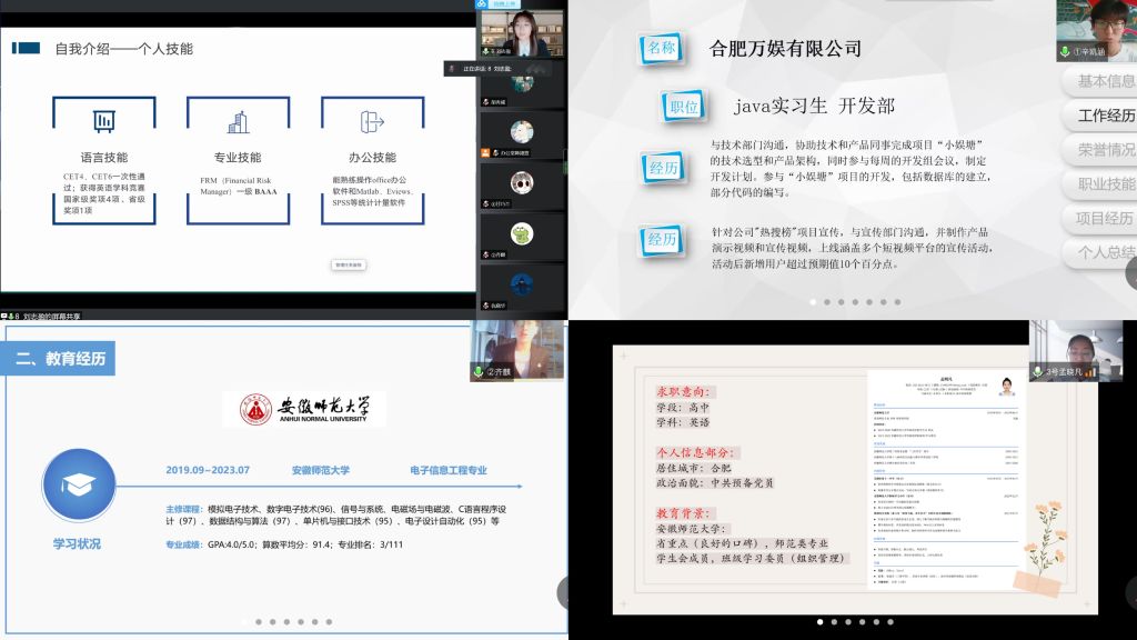 本次决赛采取线上汇报评述的形式进行共一轮环节。在决赛环节中,首先由九名参赛选手依次进行屏幕共享,利用PPT进行五分钟的自我展示和推荐。选手们的陈述自然顺畅,条理清晰地介绍了各自的简历制作背景,包括个人信息、求职意向、教育背景、实践经历、个人技能以及主要获奖情况等方面。在每位参赛选手展示结束后,评委老师基于选手的简历和PPT设计给予了点评。最终,评选出了一二三等奖及优胜奖。比赛结束后,何建华、茆巍、倪蕾、张想想老师进行总结点评。四位老师先是提到参赛选手来自于不同公司从而增强了比赛的影响力这一方面,对于选手们参赛的积极性表示了赞赏,也对决赛选手的表现给予了肯定。同时也指出了同学们在比赛过程中的不足,并提出意见。如:简历设计时应将自己的个人总结排版于简历的最后模块,做到简历设计的精而简,不应复杂、冗长;简历内容更应该着重论述自己擅长的领域以及实习经历和所获荣誉;需要明确自己的求职意向,文字内容应贴合于自己的求职意向,建立二者之间的相关性;学会换位思考,站在HR的角度看待自己简历的专业性等。通过次次比赛,也希望同学们可以相互借鉴,在比赛中锻炼自己,吸取经验,提升自己的职场竞争力。