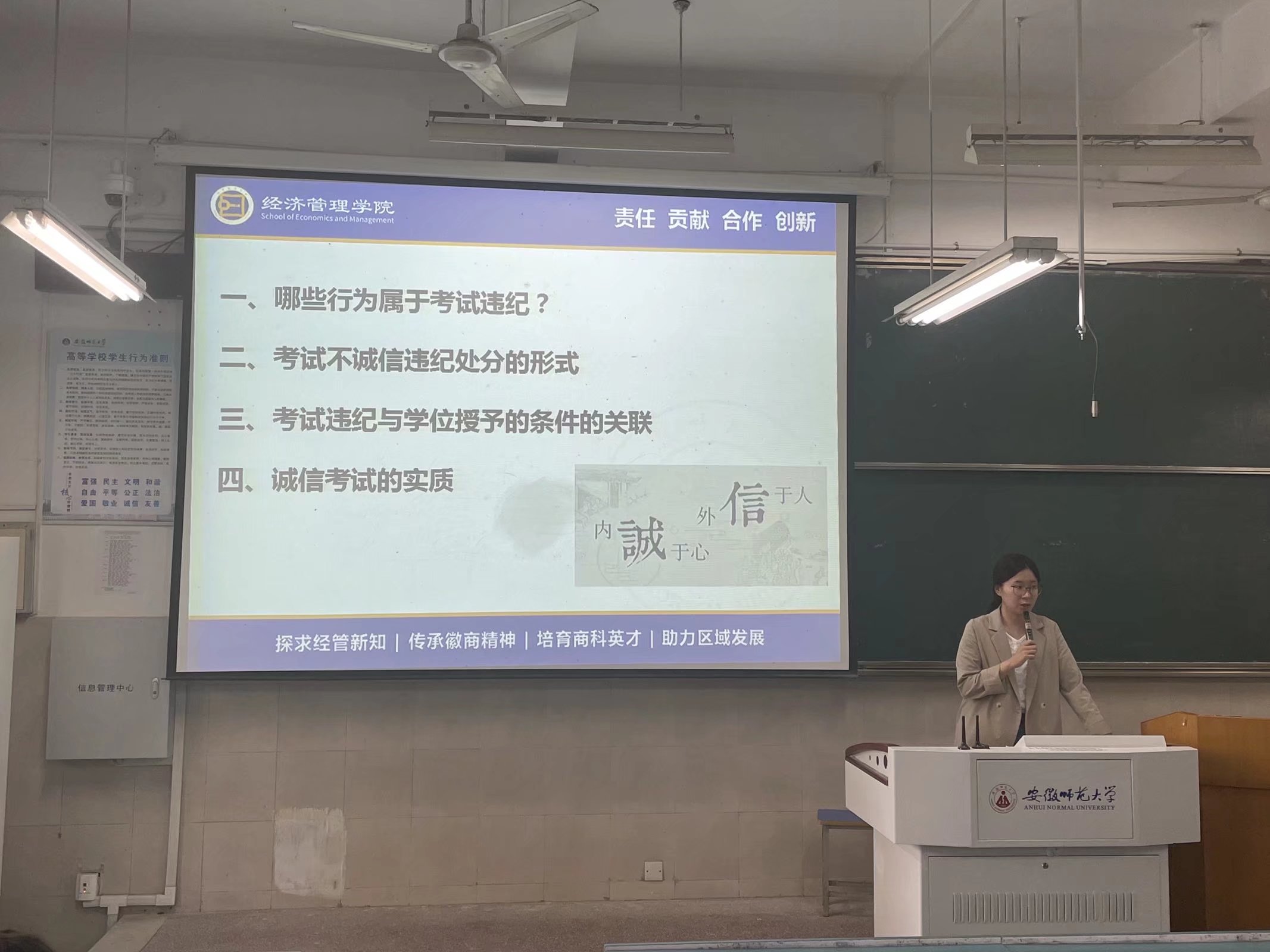 为加强同学们的诚信意识,自觉诚信考试,班级于6月7日召开诚信教育考试主题班会,班会由辅导员吴敬之老师主持,2020级金融工程、经济学专业全体同学参会。
