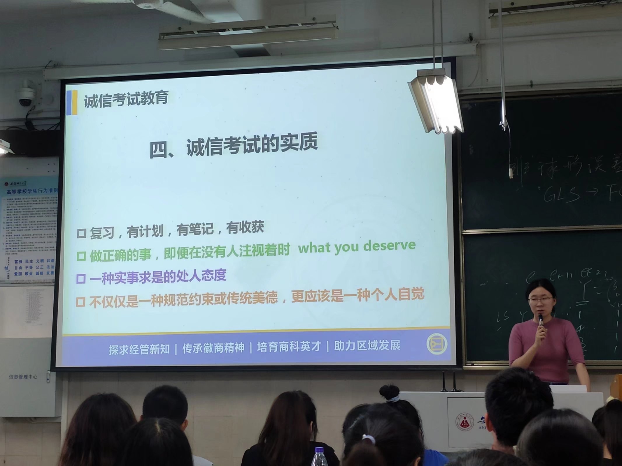 吴敬之辅导员向大家明确了考试失信违纪处分的形式,包括违反考场纪律不听劝阻者,视情节给予警告以上处分等。最后,吴敬之辅导员告诉大家诚信考试本质也是一种实事求是的处人态度,不仅仅是一种规范约束或传统美德,更应该是一种个人自觉。大家即便在没有人注视着,也要做正确的事。近期大家要及时有计划地复习,只有真正付出了才有收获。