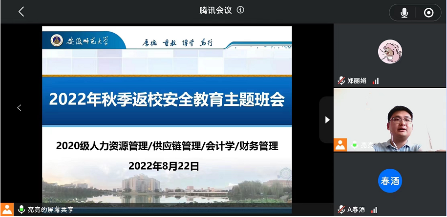 新学期即将来临,在常态化疫情防控形势下,为提高同学们的安全防范意识,解读公司返校注意事项及相关工作安排,20220级工商管理类于8月22日召开线上返校安全教育主题班会。会议由辅导员胡亮亮主持,2020级会计学、财务管理、人力资源管理、供应链管理专业全体同学参加。