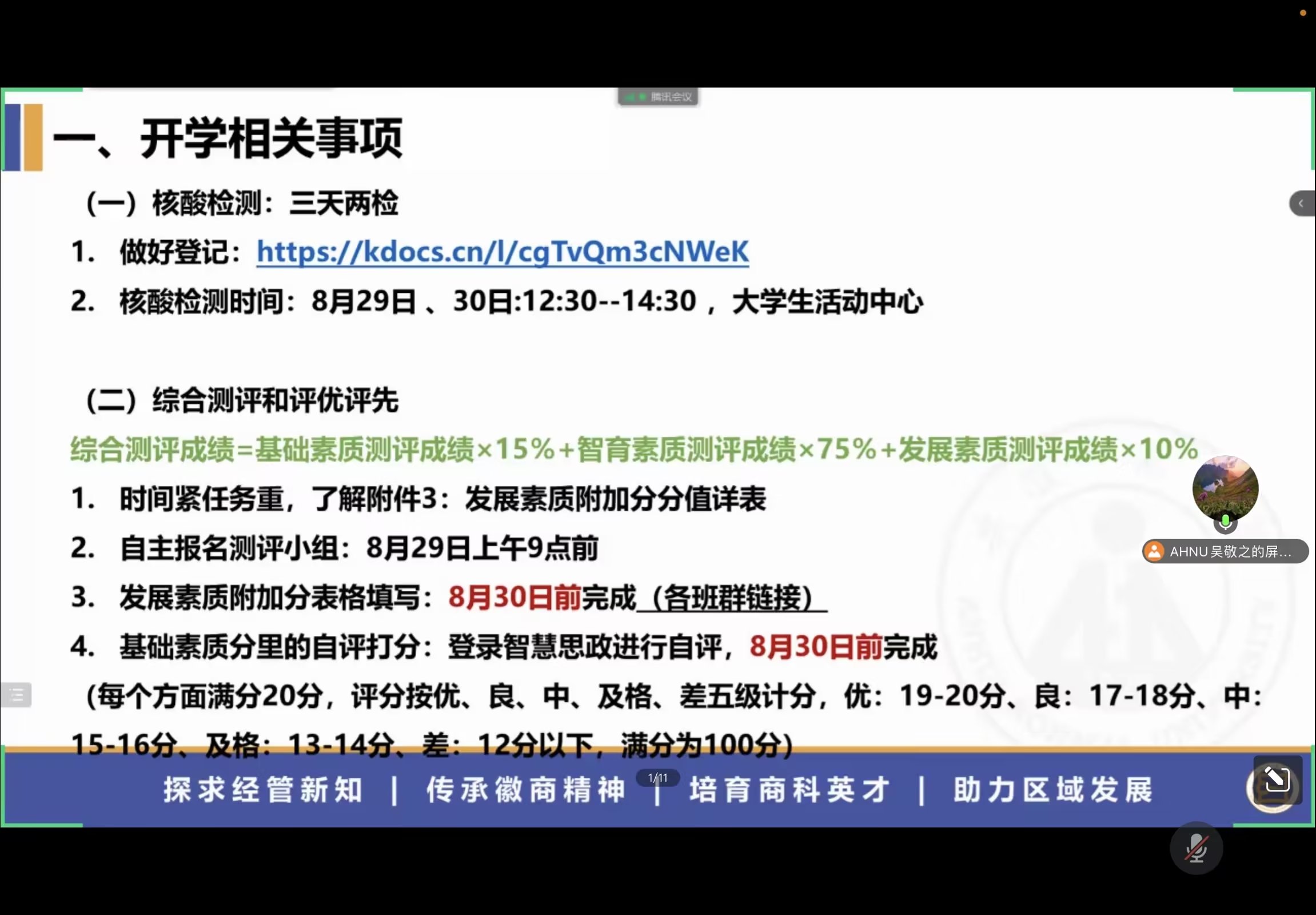 为了更好地开展新学期学习工作和疫情防控工作,吴敬之辅导员特于8月28日晚上8点通过腾讯会议召开新学期班会,参会人员为20级全体同学。