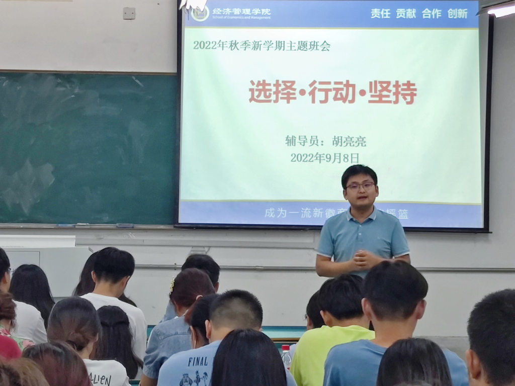 为教育引导同学们思考个人发展方向,明确新学期的奋斗目标,2020级工商管理类于9月8日在2070201及2010503教室分批次召开2022年秋季新学期“选择·行动·坚持”主题班会。班会由辅导员胡亮亮主持,2020级会计学、财务管理、人力资源管理、供应链管理专业全体同学参加。