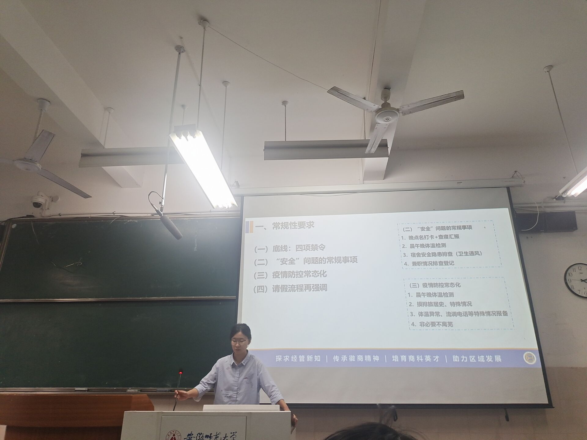 班会伊始,吴敬之老师从常规性要求、近期事项以及大三主题三个方面展开了相关的介绍和提醒。首先,吴敬之老师重申“四项禁令”底线、“安全”问题、疫情防控常态化和请假流程等常规性要求。她再次强调了班级安全管理的问题:班级宿舍安全隐患需要自查、互查,晚点名及时打卡,面对晚归不归等情况寝室长要第一时间反馈,以及兼职情况要如实登记。吴敬之老师提到了离校、离芜审批制度,着重向同学们强调请假务必至少提前三天告知并申请审批。