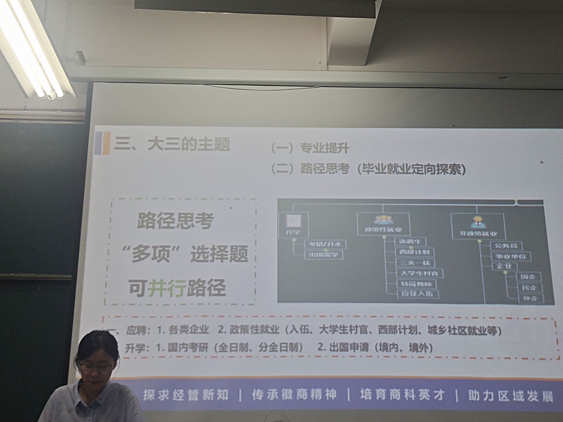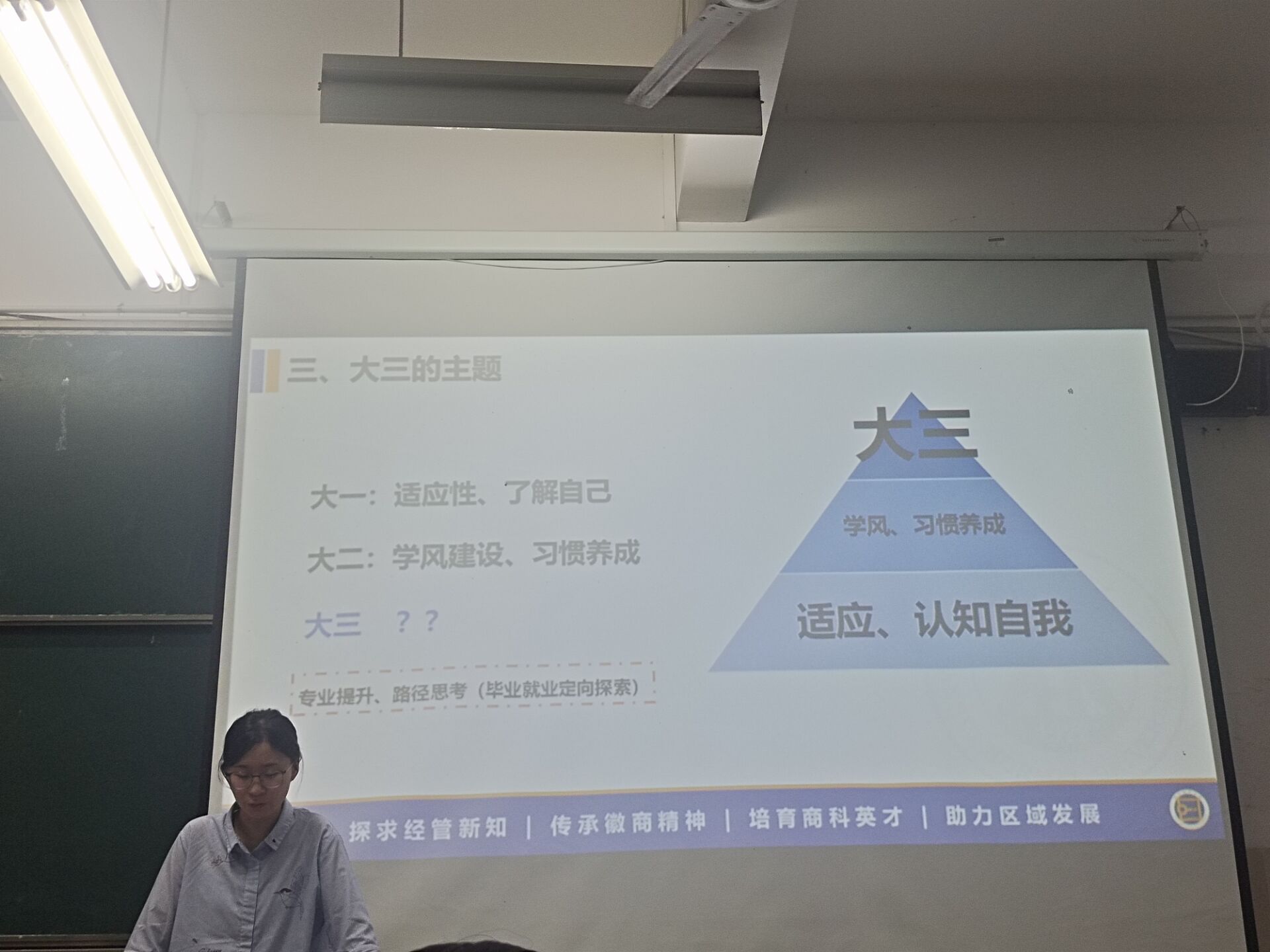 为了帮助同学们做好自身未来职业规划,明确发展方向,辅导员吴敬之于9月14日下午16点10分在行知楼教室召开毕业就业定向初探主题班会,参会人员为全体经济学、金融工程同学。