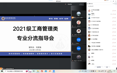 12月9日下午2点半,m88官网2021级工商管理类专业分流指导会在线上进行。指导会由辅导员刘胡海老师主讲。