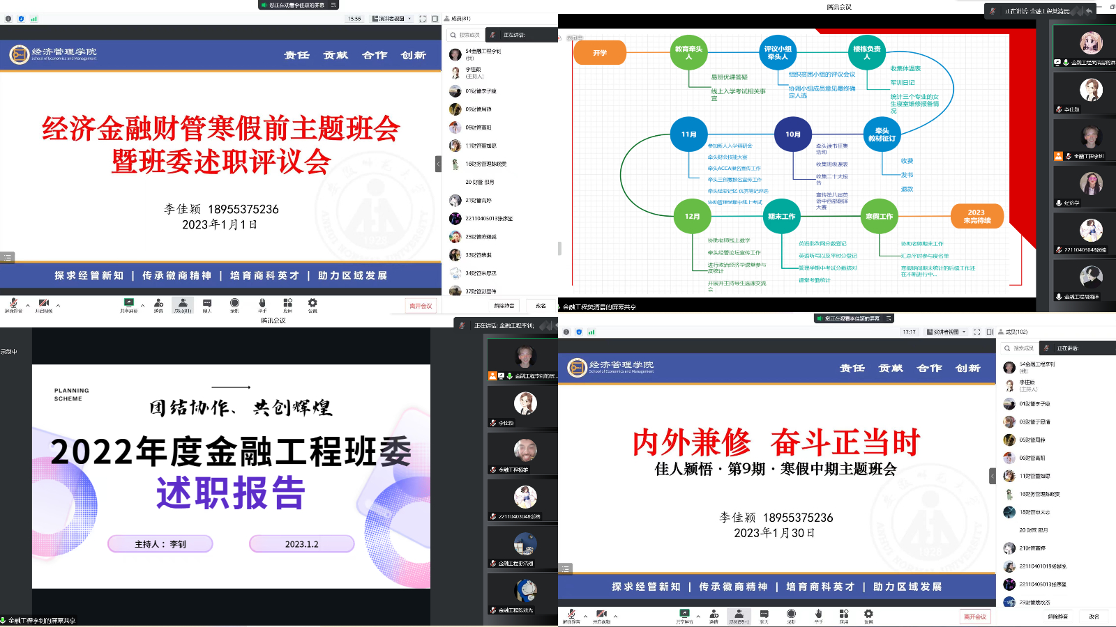 新年伊始,李佳颖以当下疫情形势为切入点,教育引导员工注意自我防护和身体健康,学会合理安排假期时间。各专业开展班委述职评议会,全体班委结合第一学期工作,围绕工作回顾、工作反思、改进措施、未来规划进行述职汇报,与会同学充分交流,积极为班集体的建设和发展建言献策。