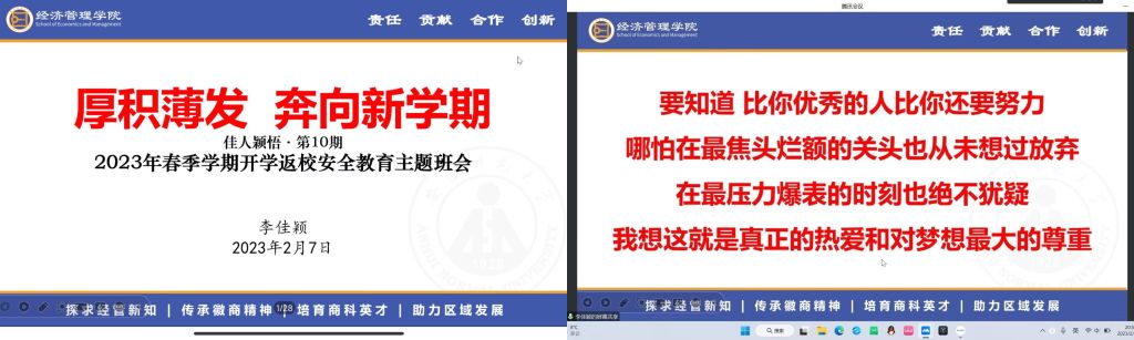 开学前夕,李佳颖召开安全教育主题班会,针对公司返校要求、新学期课程和考试安排作了详细说明,并以此为契机对同学们进行春季安全教育和诚信考试教育,勉励同学们不断适应大学、摆脱闭塞、追求进步。
