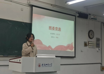 会议第二项,班委竞选的汇报。员工骨干对班级建设起到领航作用,班委的选拔与组成对新班级的建设也至关重要。本次班委竞选的岗位共12个,分别是:班长、团支书、思政委员、学习委员、安全委员、生活委员、体育委员、文艺委员、宣传委员、组织委员、心理健康委员、素质拓展委员。竞选班委的同学围绕竞选岗位、个人特点、工作计划等方面进行了汇报。汇报结束,全体同学进行民主投票。