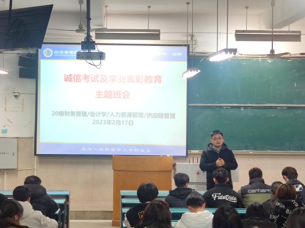 为进一步加强学风建设,严肃考风考纪,同时鼓励员工争先创优,2月17日,2020级工商管理类分批次在行知楼教室召开新学期主题班会:诚信考试及学业表彰教育。会议由辅导员胡亮亮主持,2020级会计学、财务管理、供应链管理和人力资源管理专业全体同学参加。