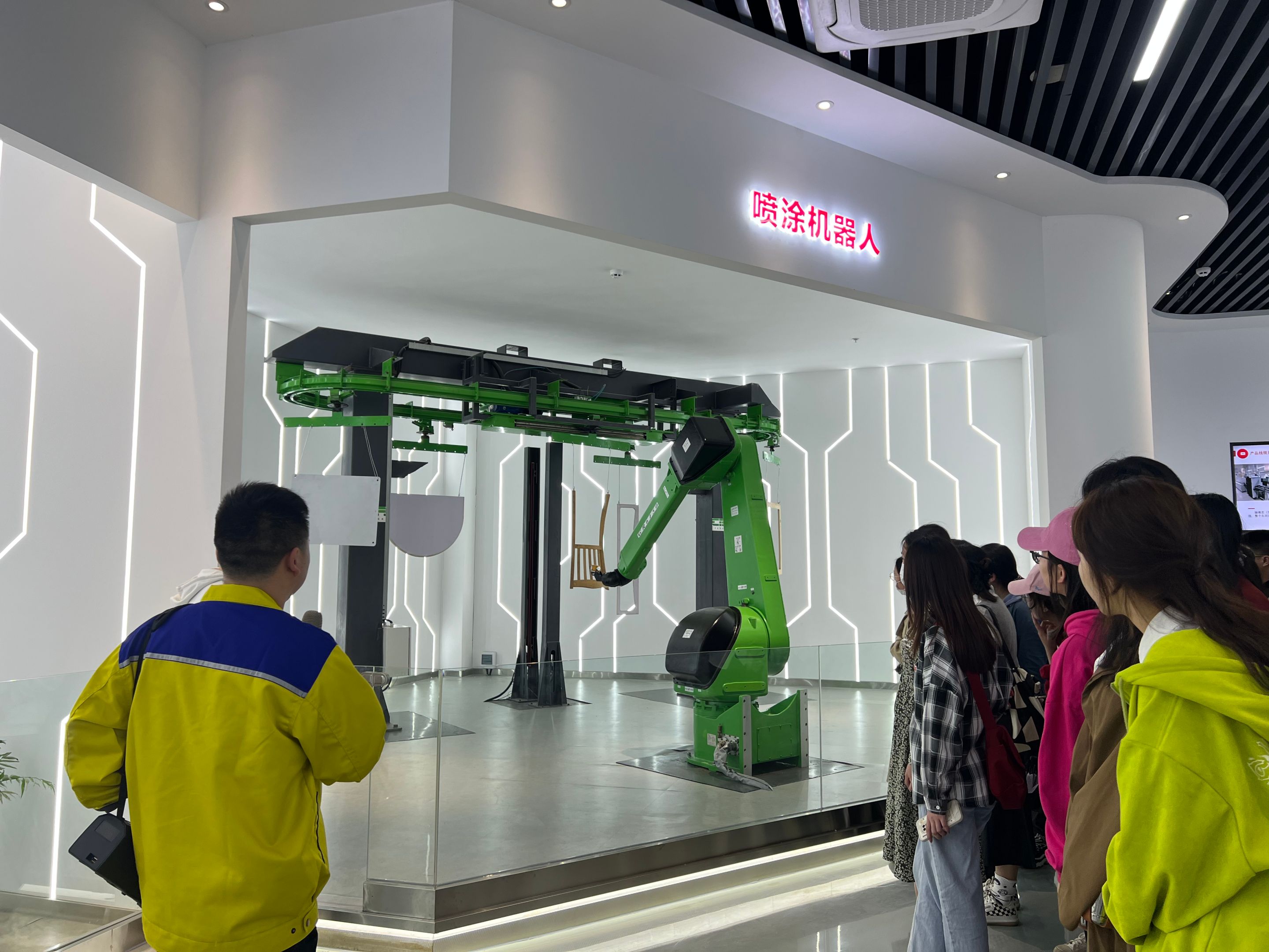参访期间,埃夫特专业人员首先带领同学们来到展厅入口,结合视频讲解埃夫特的发展历程和当前业务规模。走进技能创新成果展示中心,讲解员先后介绍了喷涂机器人,画图机器人,协作机器人等先进工业机器人,分享智能机器设备在物流、汽车、建筑领域的广泛运用场景。此外,同学们还进入了生产线观摩,了解了工业机器人的实际运作,体会工业机器人在智能设备云平台控制下的先进性。最后,讲解员鼓励同学们在高新技术日益发展的今天思考“智能智造化设备,解放人类生产力”的企业思想,努力提高个人就业竞争力。