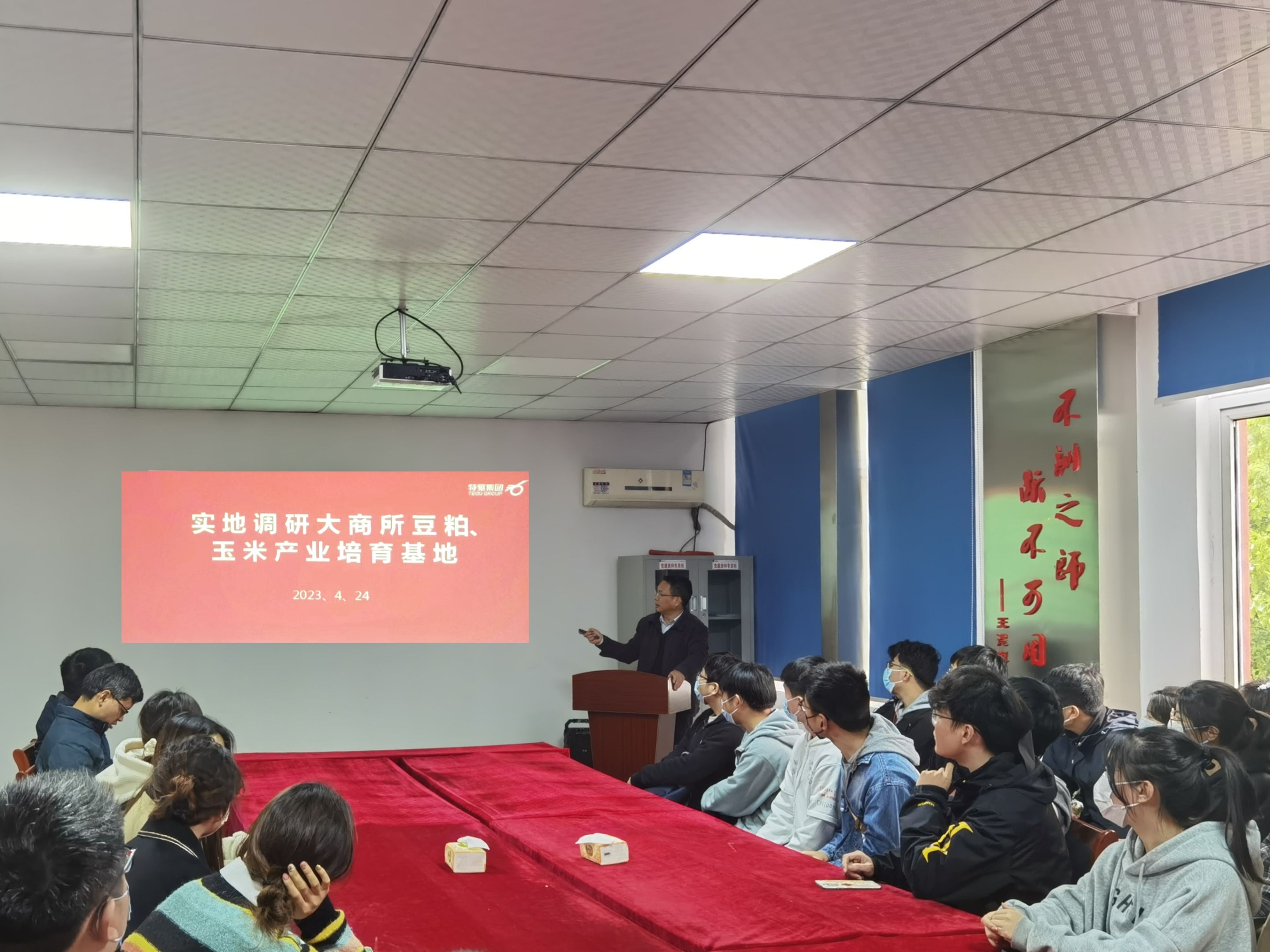活动伊始,同学们在公司总经理余运勤的带领下参观公司厂区,他结合当下豆粕需求状况与公司动物营养技术讲解了豆粕加工与饲料制作的生产工艺流程。随后,余运勤在座谈交流中,从源于希望介绍了公司起源与发展历史,从建设特驱讲述公司创始人成长经历中的“三舍三得”。通过的余运勤讲解,同学们系统了解了公司的基本情况。公司陈朴苏经理带来企业套期保值与基差交易一课。他先介绍了企业套期保值与基差的概念,再结合公司2-9月豆粕的价格为同学们演示基差的计算,通过计算结果与公司觉得适应的时点价介绍了基差是如何组成豆粕的现货采购价格,强调了基差交易给公司采购带来的现实意义,加深同学们对企业套期保值与基差交易的概念的理解。