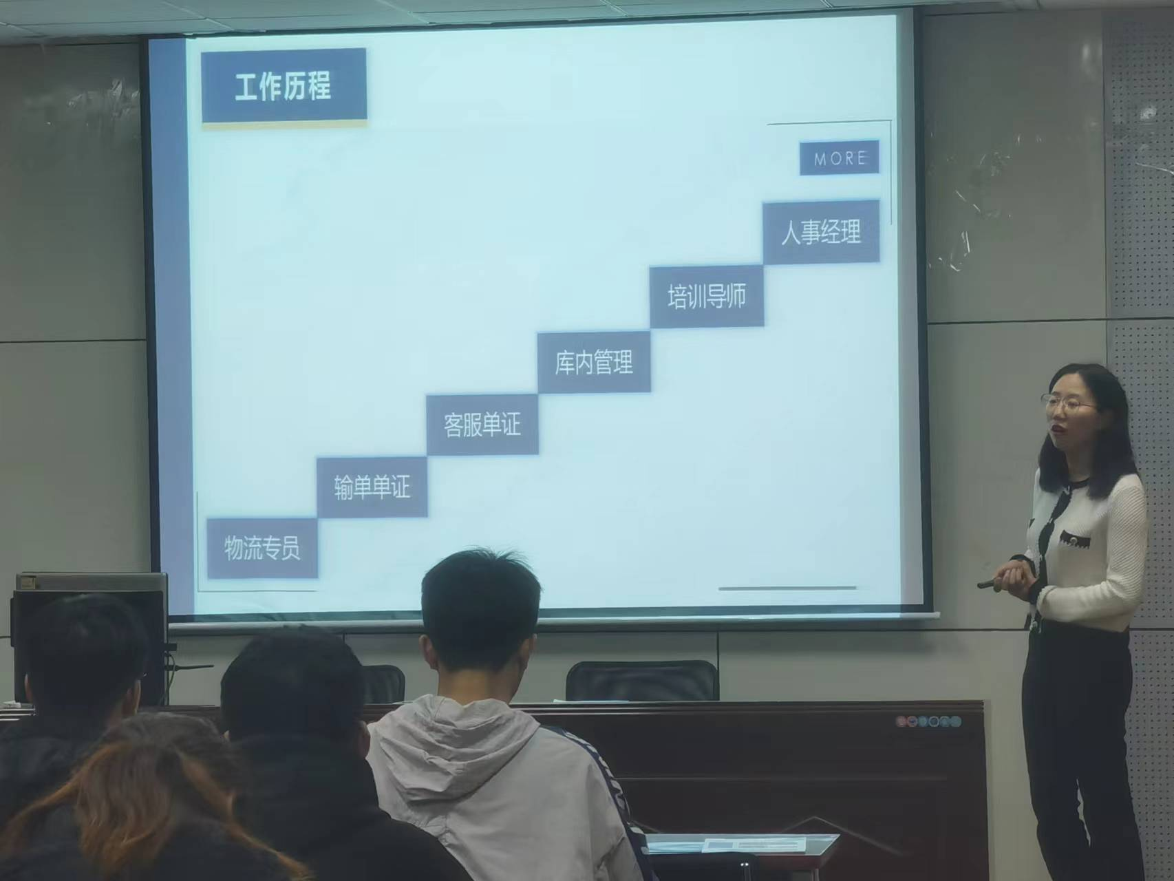 讲座中,董浪陈以公司介绍及近几年发展历程、服务内容为切入点,聚焦员工个人成长与人才培养两个阶段,结合公司人才培养计划,向大家介绍了同学实习培养阶段的内容与形势。接着,她结合自身就业经历,从理论学习、实操培训、顶岗历练和同学们做职业导航辅导。同时介绍其企业理论学习阶段帮助员工了解物流基础知识和公司企业文化,专门针对专业领域进行授课,帮助员工更好的了解企业、融入企业;实操培训阶段会创造宝贵的学习机会进入公司各个部门进行轮岗学习,积累实战经验;顶岗历练阶段会为员工制定一对一的职业发展晋升通道,帮助员工进行未来职业发展规划。