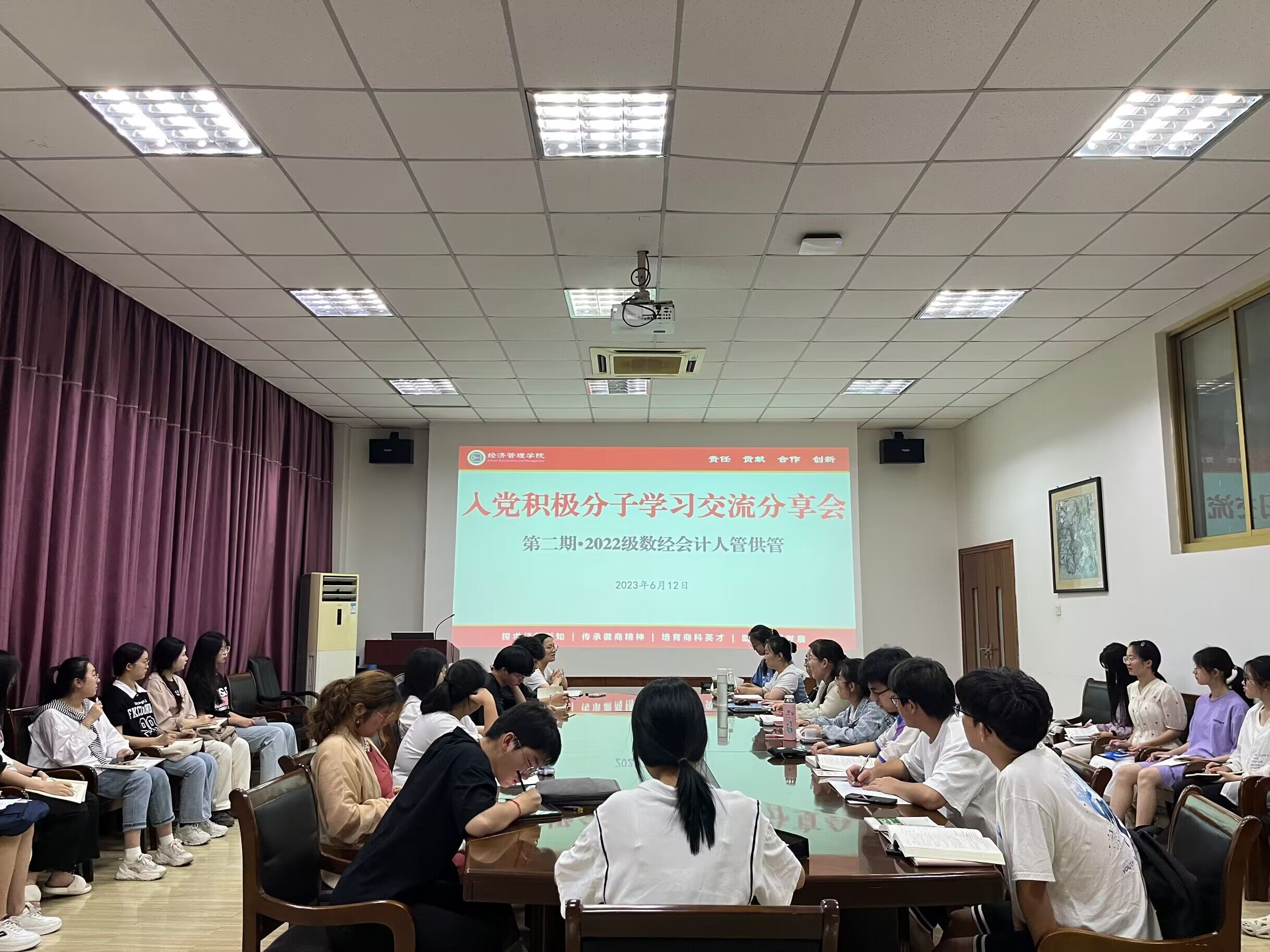 为加强入党积极分子党性修养,提高思想觉悟,筑牢信仰之基,6月12月晚在第一会议室组织开展第二期学习交流分享会,会议由辅导员盛亚琴主持,2022级数字经济、会计学、人力资源管理和供应链管理专业28位入党积极分子参加。