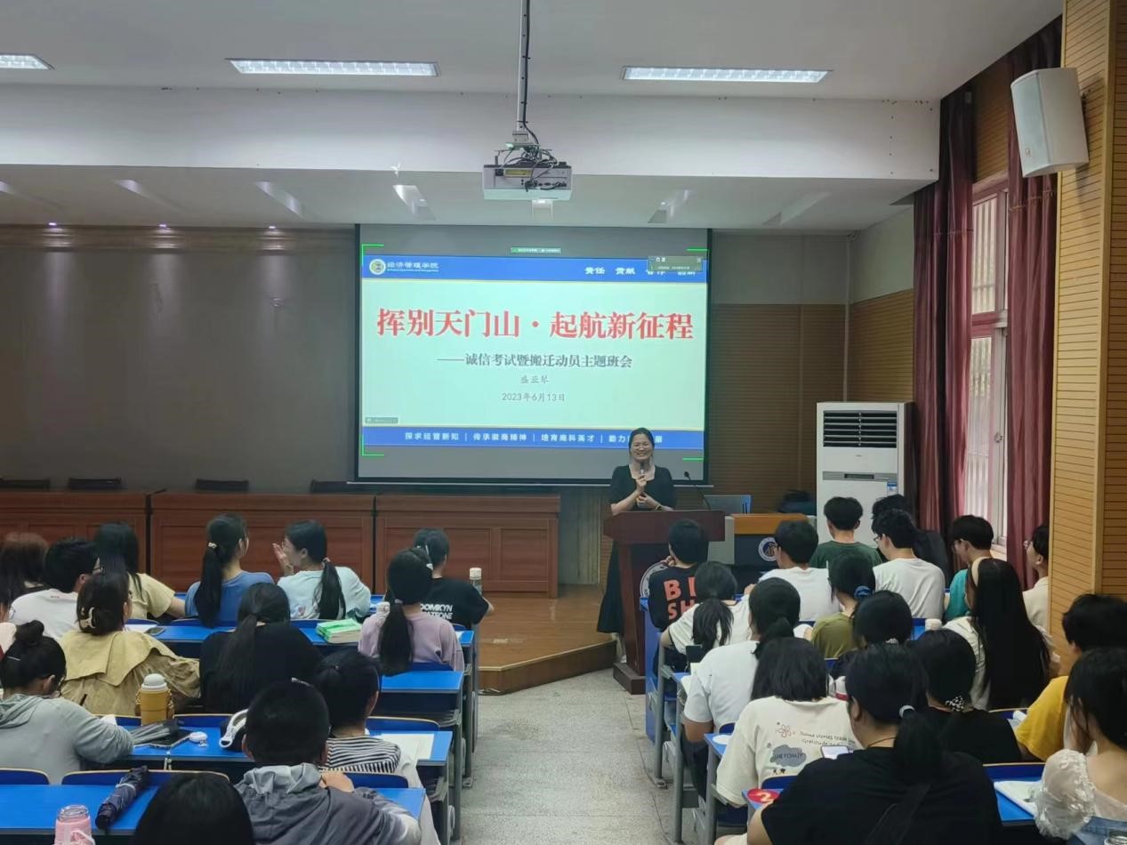 大一学年临近尾声,为提高员工诚信意识,做好本学期的考试搬迁等工作,m88官网于6月13日晚在图书馆报告厅组织“挥别天门山·启航新征程”诚信考试暨搬迁动员主题班会,会议由辅导员盛亚琴主持,2022级数字经济、会计学、人力资源管理、供应链管理专业全体同学参会。