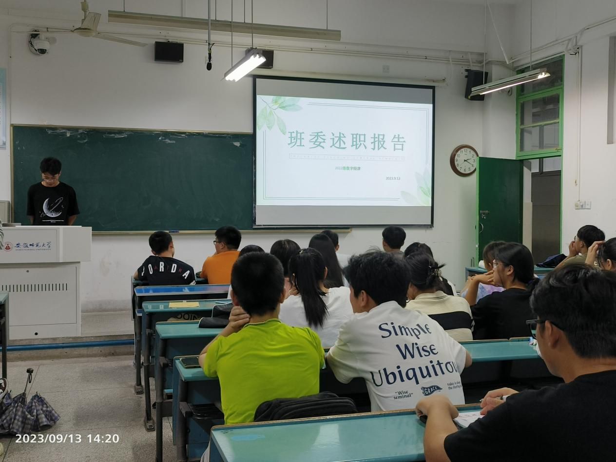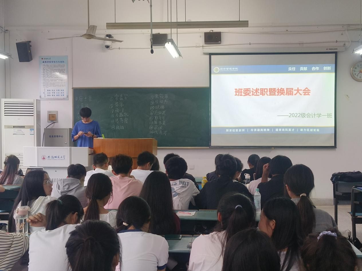 为激励班委踏实作为,明确未来工作方向,9月13日,2022级数字经济、会计学、人力资源管理、供应链管理专业在行知楼7号楼教室召开班委述职班会,会议由各班班长主持,辅导员盛亚琴参与。22-23学年班委轮流上台回顾一学年工作收获与不足,并向全体同学介绍未来班委工作规划。部分班委由于个人原因辞去职务,希望有更多的同学能够积极竞选,服务班集体建设;也有很多班委选择继续竞选留任,持续为班级贡献自己的力量。
