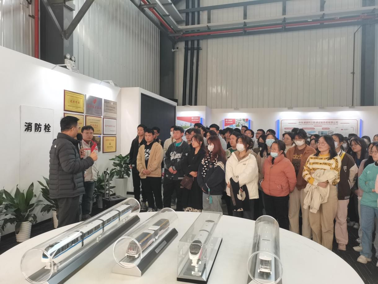 在中车姚总的带领下,同学们首先参观了企业展厅。展厅内陈列着各式各样的铁路车辆,包括高铁、地铁、城轨等。讲解员详细介绍了主营业务、产品性能、技术特点以及在国内外的应用情况,同步还讲解了企业生产的一些核心零部件,如牵引电机、制动系统等,深感企业在技术研发和生产制造方面的实力雄厚。