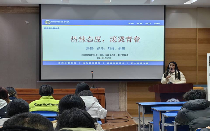 为护航员工成长发展,引导员工快速进入学习状态,进一步加强班集体建设。2月27日晚,2023级经济、金融、数经专业在天门山校区图书馆报告厅开展“热辣态度,滚烫青春”主题班会,会议由辅导员付擎主持。