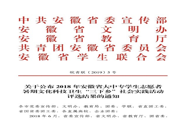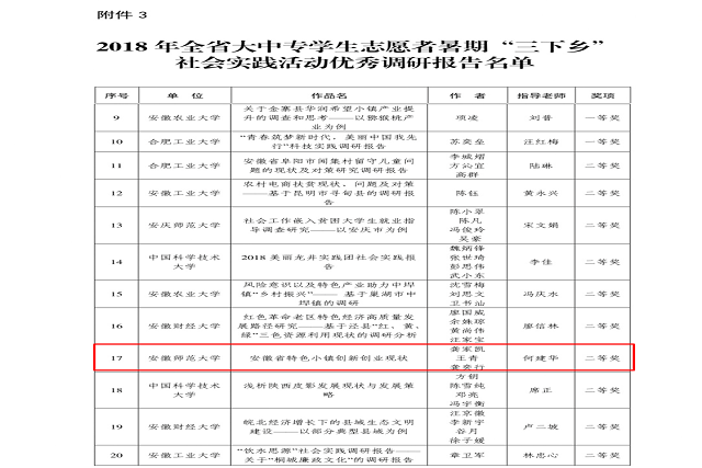 (老员工创业协会 文/祝东秀 图/龚家凯)近日,安徽省委宣传部、省文明办、省教育厅、团省委、省学联公布了备受瞩目的2018年安徽省大中专员工志愿者暑期文化科技卫生“三下乡”社会实践活动评选结果,本次暑期社会实践共有30余万人参加,公司“m88官方网站登录地址赴安徽省特色小镇创新创业现状调研团队”脱颖而出,由龚家凯、王青、龚奕行撰写的“安徽省特色小镇创新创业现状调研报告”荣获省二等奖,为去年的调研工作划上了圆满的句号。