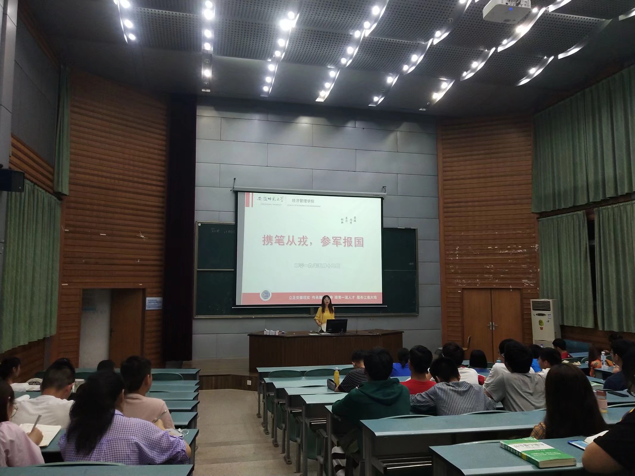 本网讯(2018级经济学类 汪纯)为响应国家征兵号召,进一步调动同学们对于应征入伍的积极性,5月12日晚七点半辅导员李萨萨于2010105教室为18级经济学类及会计学(ACCA)专业员工召开以“携笔从戎,参军报国”为主题的征兵入伍主题班会。