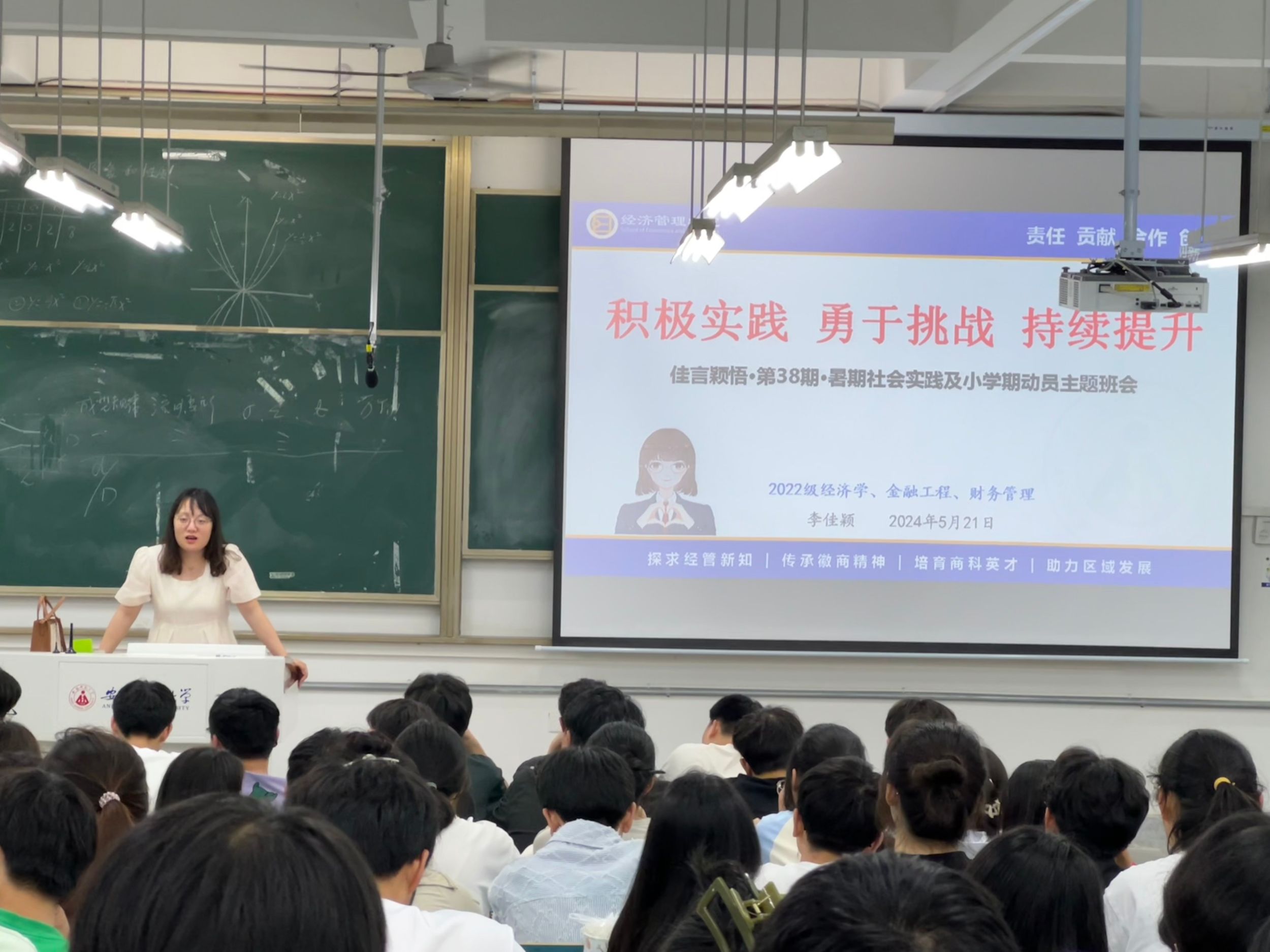 5月21日晚,2022级经济金融财管围绕“积极实践·勇于挑战·持续提升”开展暑期社会实践及小学期动员主题班会,会议由辅导员李佳颖主持,2022级经济学、金融工程、财务管理全体同学参加。