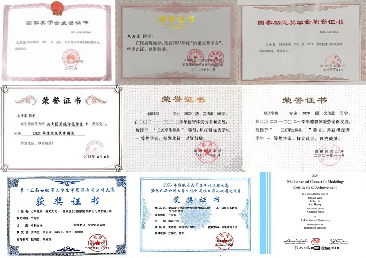 她深知唯有埋头才能出头,大学四年综测均分为94.13,专业成绩和综合测评均第一,曾获国家奖学金、洪银兴奖学金,“省优秀毕业生”、“校优秀毕业生”、“校自强之星”等荣誉称号共17次,现以专业第一的成绩推免至中南财经政法大学。她将经济金融等专业知识运用到比赛中去,积极参加各类学科竞赛,大三时作为队长参加了“正大杯”第十三届全国老员工市场调查与分析大赛,获得省级二等奖。获2023年美国老员工数学建模比赛国际二等奖、安徽省统计建模大赛省级三等奖等校级及以上奖项十余项。在专业课程学习之余,她积极参加科研训练,努力提高自己的科研能力。2022年4月份她作为主持人成功申报国家级老员工创新创业训练计划项目、优秀毕业论文培育项目。基于科研训练,文浩蓝发表了两篇SCI论文,其中一篇为第一作者,另一篇为第三作者,这是m88官网本科生首次以第一作者身份在SCI期刊上发表论文。