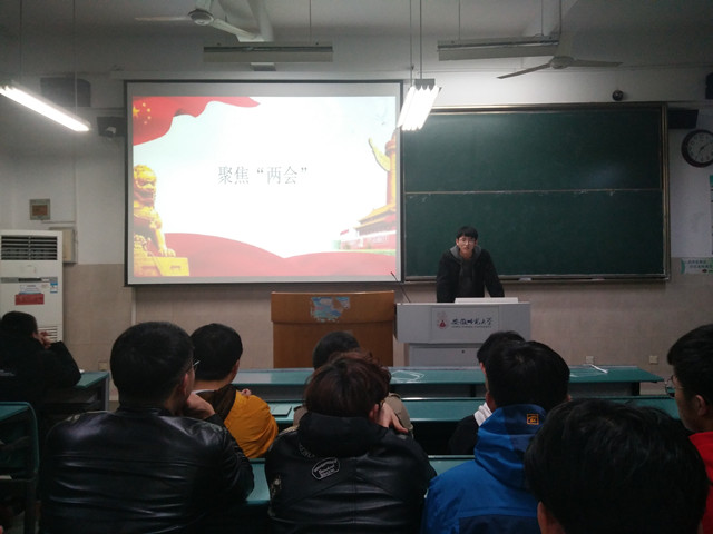 会议分三部分。首先,张漫从两会简介、两会关键词、习近平“金句”、两会提案四个方面给大家介绍两会,总结概括了今年的两会热点,尤其是两会关键词——住房、校园安全和假冒伪劣产品,与我们的生活息息相关。其次,同学们就两会的提案进行激烈讨论并发表看法,真切的深入两会的氛围中。最后,张漫表示每年的两会都应该是我们关注的焦点,两会可以使我们能够在第一时间准确的认识到党和国家的发展要求和工作方向,作为一名当代的老员工,应该积极关注国家时事政治,关注祖国发展。
