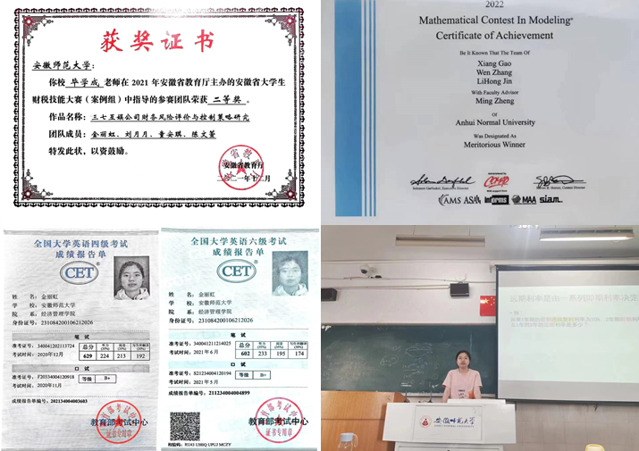 2021年11月,作为队长,参与安徽省财税技能大赛,获得省级二等奖;2022年1月,作为核心成员,负责数据收集与论文撰写工作,参与美国老员工数学建模大赛,获得国际级一等奖;此外还获得十余项校级、院级奖项。这些成绩取得的背后,离不开扎实的专业基础与灵活的实践能力!