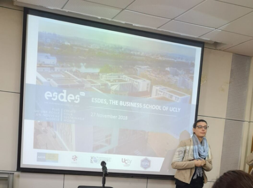 11月27日中午11点40分,Catherine老师和2018级中法人管班员工举行了见面会,见面会的主题为《ESDES,THE BUSINESS SCHOOL OF UCLY》。Catherine老师向同学们介绍了公司的地理位置、教室、课程安排、资金、住宿等,面面俱到,同学们对此充满了好奇。见面会不仅仅有Catherine老师对法国的介绍,还有提问环节。同学们用流利的英语和Catherine老师交流、互相了解,同学们开场的一个问题——法国是否有空调,瞬间让气氛活跃了起来,Catherine老师回答的结果当然是“NO”,之后Catherine老师便向我们介绍了法国的气候。作为员工,最关心的就是放假情况了,Catherine老师把一年的放假情况向我们作了相关的介绍,长长的假期让我们对法国充满了向往。