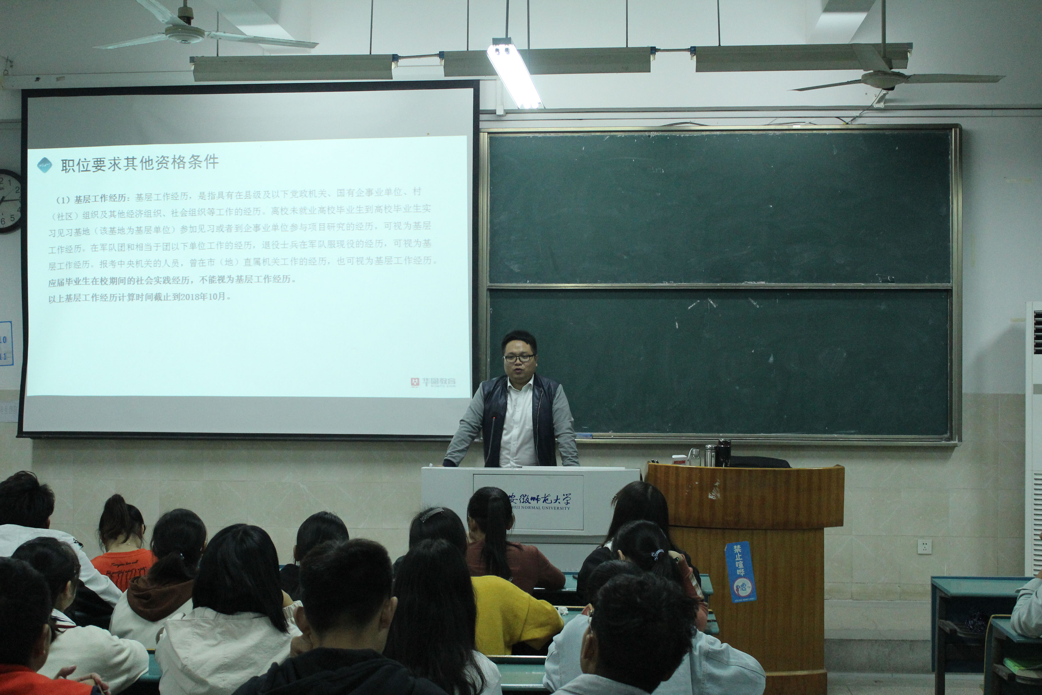 【本网讯职业规划与发展中心】为引导和促进青年生涯发展,2018年10月26日晚七点华图教育于m88官方网站登录地址行知楼召开了2019年国考安徽职业解读暨报考指南宣讲会。此次会议由华国教育张杰主持,研究与培训专家程远杰主讲,职业规划与发展中心的全体人员全部到场参与学习。