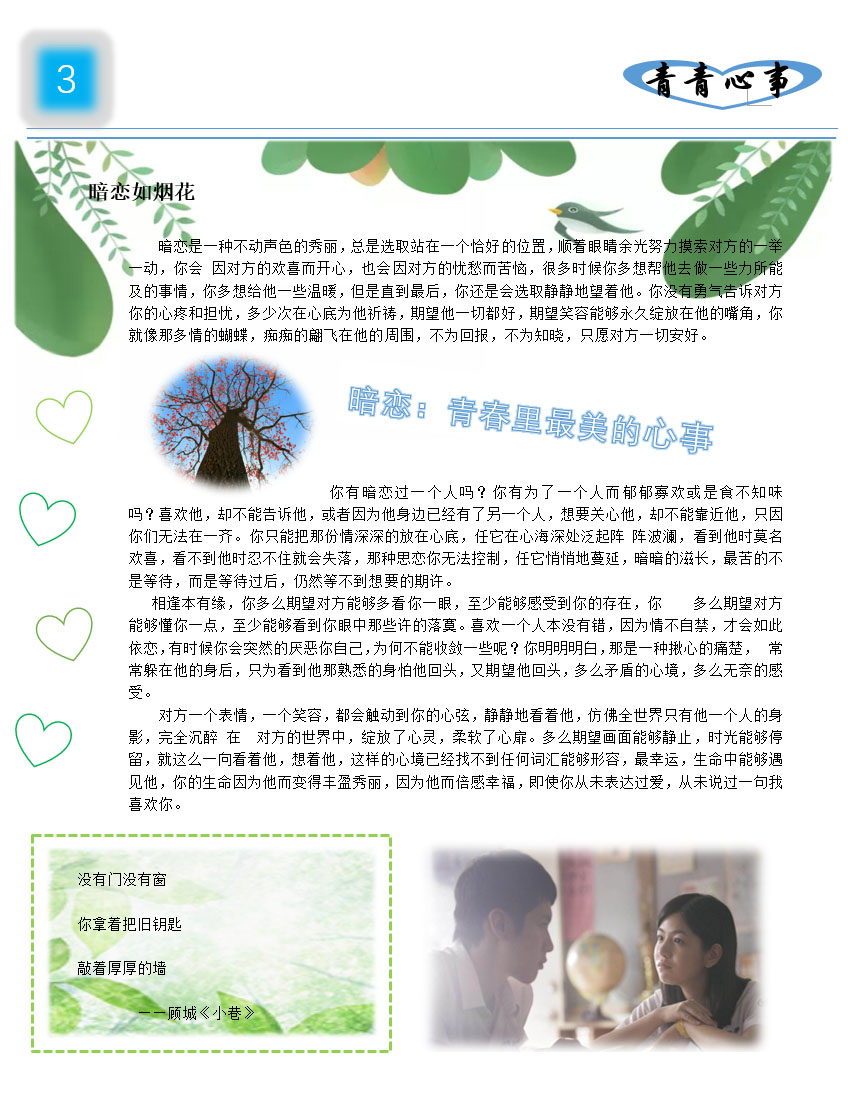 恍然间,已经开学快两个月了,十月的心理月刊又跟大家见面啦!许久不见,最近过得怎么样呢?是忙碌于处理员工工作、参加社团活动,还是在教室里日复一日地埋头读书呢?如果觉得自己比较清闲,就让自己行动起来吧,充实的生活更容易收获快乐哦。无论周围的环境如何变化,只愿我们不要忘记自己最初的样子。一场秋雨一场寒,天气转凉,亲们注意添衣呀。接下来,就跟随小编一起走进这个月的心理月刊吧!