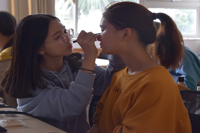 首先,化妆队队长简单介绍了化妆队的主要任务,接着介绍了不同场合下该用什么样的妆容,并通过一段教学视频教新队员们化基本的妆容,如:底妆,眉毛,眼线,腮红等。丁雯学姐在培训过程中强调,这些都是以后工作中将会遇到的最实用的部分,希望队员们能够认真学习并且熟练运用到实际中去。看完这段视频,同学们受益匪浅,跃跃欲试。接着,队员们两两一组,相互配合,给自己的搭档化妆练习,学姐们也来回巡视着,不时地予以帮助。整个过程中充满了欢声笑语,乐趣无穷。
