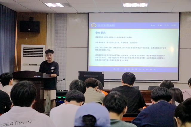 蔡淳志宣读安全要求,提醒各团队队长让有需求的人自行准备好个人药品,并提醒安全员从暑期社会实践开始时在安全员群里进行安全汇报,各团队成员随时保持联系畅通,最后向大家介绍了安全汇报模板。