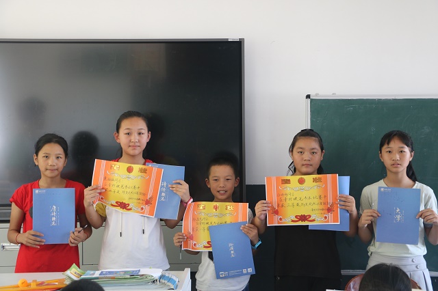 7月21日上午,队员们如往常一样提早半个小时来到水吼中心小学备课和布置教室。今天上午第一节课是数学课,小队队员陈巍将上次布置给同学们的九宫格数独题目以清晰的思维和幽默风趣的语言准确的表达和灌输给同学们,使同学们感受到了数学别样的魅力。第二节课是书法课,陈巍在讲解完字体结构、笔画、运笔正确方式后,为了让同学们加深印象,同时提高同学们对书法的兴趣与积极性,以《将进酒》为题当堂进行了硬笔书法比赛,并评选出前三名,颁发奖状及老师精心准备的奖品。