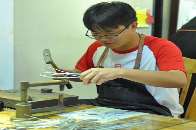 “不积跬步,无以至千里。”为了更深入地了解芜湖铁画的制作工艺和匠人精神,团队前往芜湖工艺美术厂与铁画匠人进行了访谈。铁画匠人们分享了他们的创作经验和心得体会,让队员们对铁画的艺术魅力有了更深刻的认识。在芜湖古城飞龙铁画,队员们还亲身体验了铁画 DIY 制作。在铁画师傅的指导下,队员们亲手打造属于自己的铁画作品,不仅感受到了铁画制作的乐趣,也更加珍惜这一传统艺术的来之不易。此外,团队还在校园内开展了关于铁画认识的调查问卷活动。通过问卷调研,了解了广大师生对芜湖铁画的认知程度和兴趣点,为铁画的宣传推广提供了数据支持。