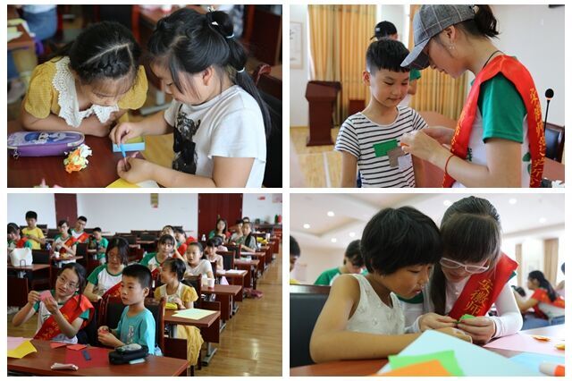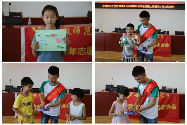 本次支教还安排了开发智力和动手能力的折纸课。担任此次折纸课的李思梦小老师,一步一步耐心地带领小朋友们学习四叶草、手表等有趣的折纸。小朋友们碰到比较复杂的步骤时,都积极地向志愿者们询问。折纸过程中,有些小朋友还充当起了“小老师”,教志愿者折了一些自己的“宝贝”,并发挥想象力和志愿者共同制作了一些令人耳目一新的作品。有些小朋友将自己精心折出的作品送给志愿者,志愿者们也惊喜地收下,骄傲地向自己的小伙伴介绍收到的第一份礼物。折纸活动结束后,小朋友大方上台,大声流利地向大家介绍自己的作品。在这