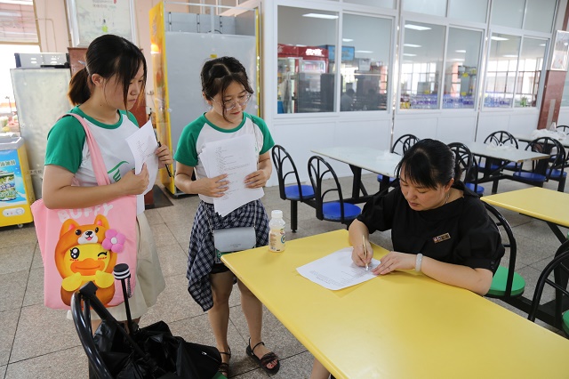 当校内的问卷调查有序地进行着,校外的问卷调查行动也如火如荼地展开着。志愿者一批小分队到达公司对面的德胜广场进行问卷调查,一位阿姨正忙着自己手头的活计,但她看到志愿者们在烈日下奔走,还是放下了手头的活,给志愿者填写调查问卷。阿姨和蔼可亲,说看到志愿者就像看到自己的孩子一样,很亲切。