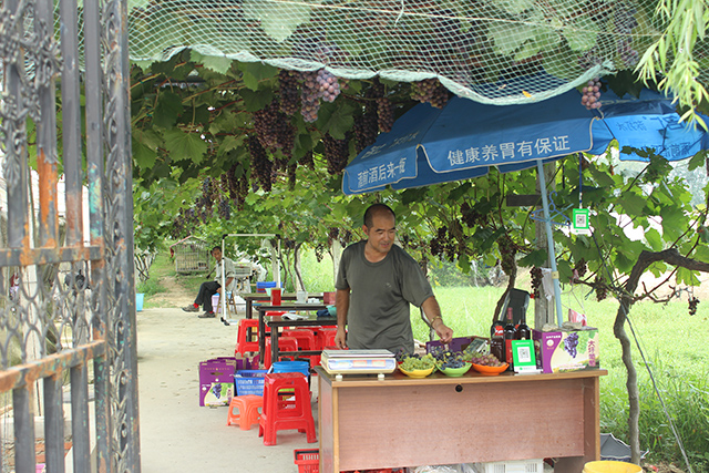 下车后,接待我们的是明星葡萄园的贾先生,他为大家准备了各种各样的葡萄,比如夏黑,阳光玫瑰等等。贾先生热情的为我们讲解了许多关于葡萄园的知识,他告诉我们,这座葡萄园有70%是日本品种,并且他们采用人工除草,极少使用化学技术,引进了先进的滴灌技术,建立起大棚园区,这样可以减少雨淋,从而减少了病虫害。除了农民们的用心和努力,政府也采取了相应的措施来推动葡萄园的发展,如引导农业转型,发展休闲农业等等。