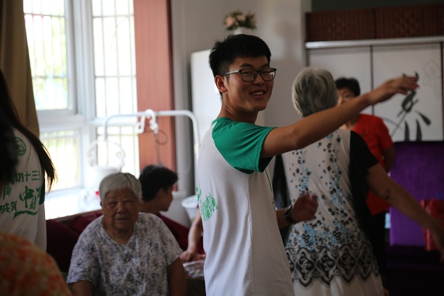 在志愿者到达照料中心时,才站在门口就听见里面的音乐声和奶奶们的欢声笑语,氛围融洽。志愿者们想象中的老人们,她们的生活状态应该是坐在木制的摇椅上乘凉,几个人坐在一起唠唠嗑,是那种人至暮年的慵懒。奶奶们这种面对生活的年轻活力好心态,让人们懂得如何享受生活、享受乐趣,知足常乐。照料中心的负责人一看志愿者在门口,连忙热情地领着他们去大厅和奶奶们见面,奶奶们一听孩子们过来了,都坐在沙发上喊着:“欢迎欢迎!”在奶奶们的掌声中,志愿者们有点羞涩,还有点紧张,但看着她们慈祥的面容和笑容,欢快的气氛使志愿者们完全融入,就像回到家一样。志愿者们开始为奶奶们表演节目了,一曲戏曲串烧拉开了帷幕,铡美案、鹬蚌相争、穆桂英挂帅,每段都很精彩;两位志愿者搭档的相声表演,幽默风趣,惹得奶奶们开怀大笑;朗诵《一个老兵的歌》抒发对那个战争年代老兵盛绚经历的情怀;你划我猜游戏火热进行,奶奶们都很积极地参与,像孩子般回答对了拿到奖品就很满足;节目最后志愿者和奶奶们一起合唱打靶归来,奶奶们唱得慷慨激昂,仿佛找到了昔日的回忆。作为回馈,奶奶们也给志愿者带来了广场舞表演,热情高涨,奶奶们精神奕奕,中气十足,边跳边喊着:“嘿嘿!”,现场氛围热烈,志愿者也加入到广场舞队列,跟着奶奶们一起扭动起来,奶奶们的舞步轻巧娴熟,年至花甲的老人有着和年轻人一样的朝气和活力,火热的氛围令人心情愉悦,都舍不得结束这场快乐的志愿行程。