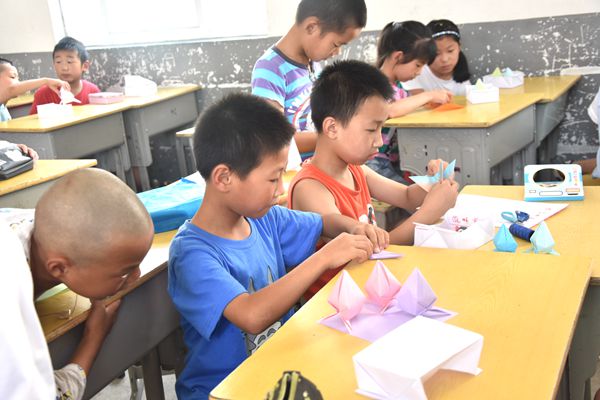“小溪姐姐,这个送给你;大俊哥哥,送你一个章鱼……”在手工课上,孩子们把自己的第一个作品送给了自己喜欢的哥哥姐姐们,他们很朴实,喜欢一个人会直接表达出来,他们也很“皮”,把折的好桃子画上两只眼镜,当作章鱼送给队小老师,有的把折好的小筐当作帽子,戴在头上,抢着和老师们一起拍照。