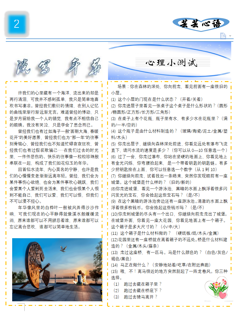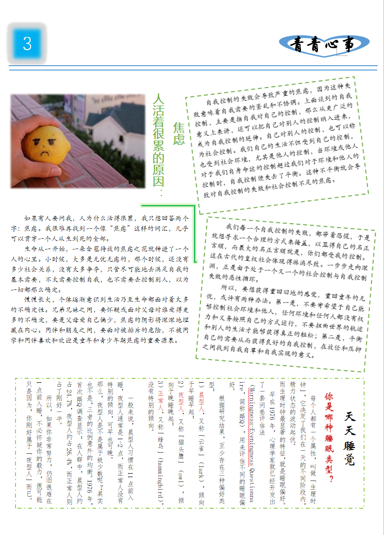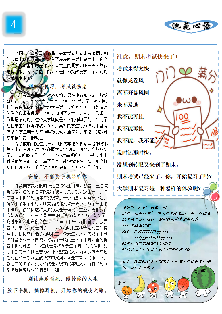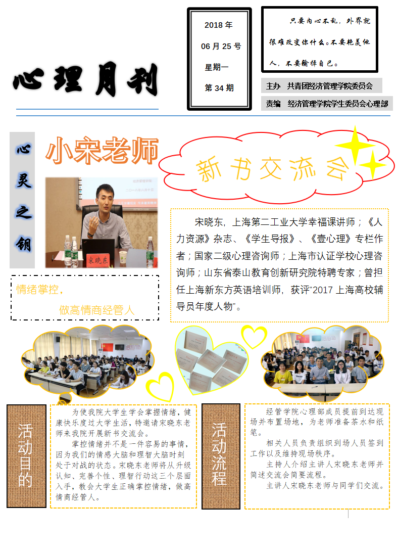 六月将尽,夏至已至,本学期最后一期月刊也和大家见面啦!本期月刊介绍了宋晓东老师的新书交流会, 如有意向, 同学们也可以关注小宋老师的微信公众号“小宋老师的幸福课” , 相信大家一定会有所收获。临近期末考试了 ,亲们复习得怎么样了呢?本期月刊也将给大家介绍一些复习小窍门,希望能对大家有所帮助。 最后,预祝泥萌期末可以不挂科,考试顺利啊!