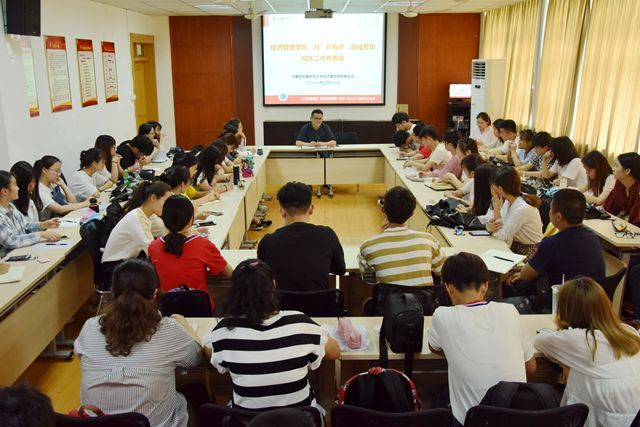 本网讯(新闻部 王笑晴)杏坛桃李万千树,相承一脉九十年。为迎接九十周年校庆,做好服务接待员工的工作,m88官网于5月18日中午在行政楼一楼党员电教化中心举办了以“‘经’彩有你,自成芳华”为主题的员工工作布置会。院员工会各部门主要负责人和志愿者参与了此次会议。会议由院团委副书记甘伟主持。