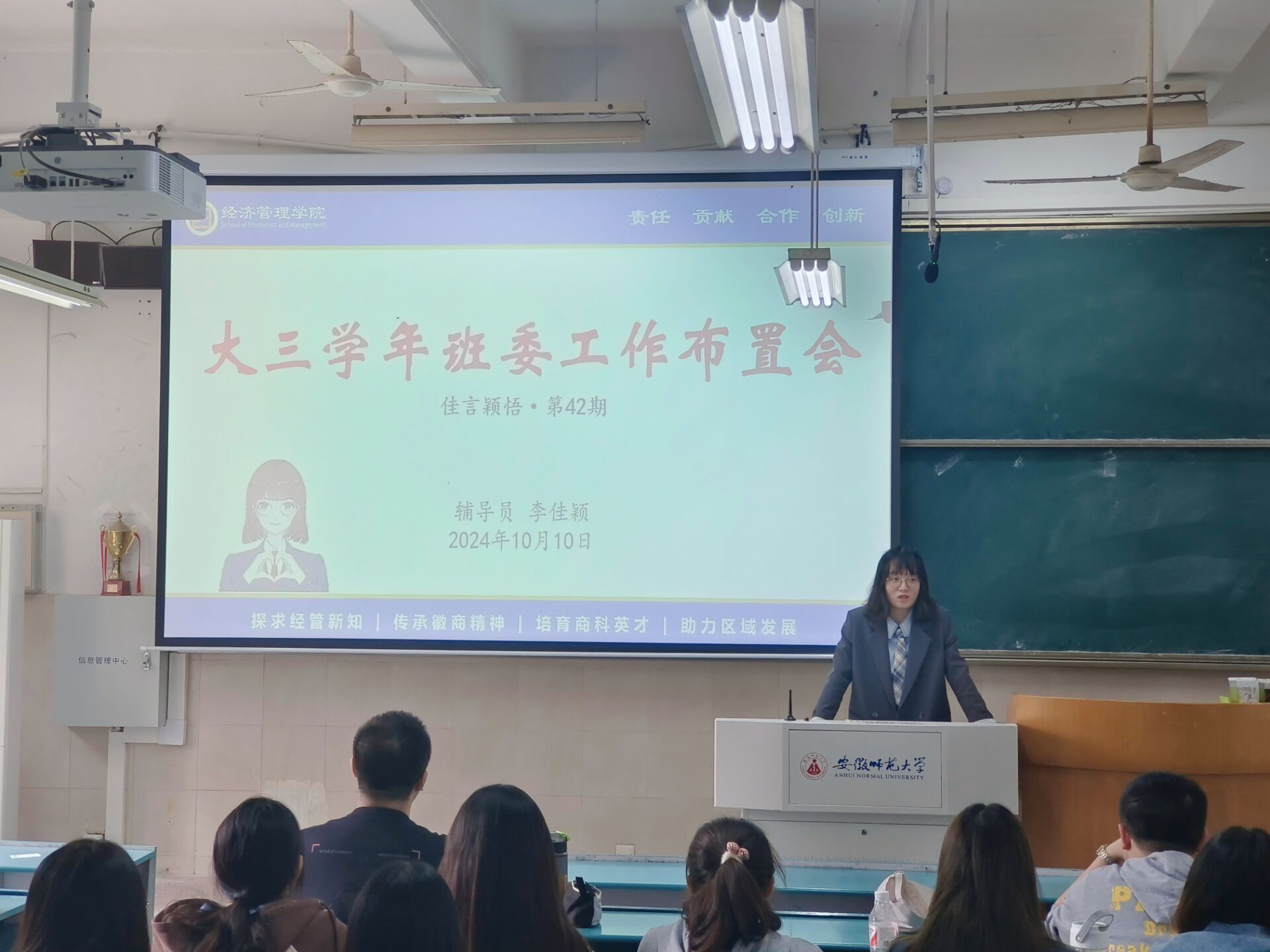 会议伊始,李佳颖肯定了全体班委过往的辛苦付出,鼓励班委成员要团结一心,以服务同学为己任,共同促进班级集体的繁荣与发展。随后对班委工作提出具体要求,要求班委成员要及时汇报工作进展、明确分工、形成闭环。李佳颖梳理了大三学年的关键性工作,明确各位班委的具体职责,确保班级工作的统筹性和细致性。最后,她对基本工作技能进行了培训,旨在提高班委成员的事务性工作能力,提高工作成效。
