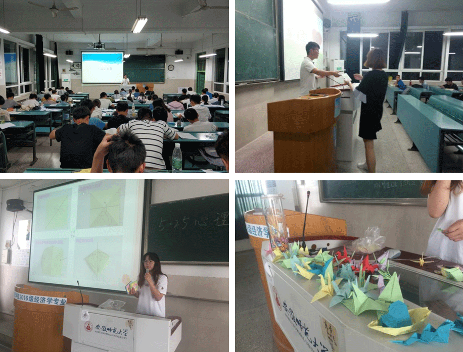 手工体验活动的内容丰富多样,有折千纸鹤,制作书签,互送名片等多种形式。其中,2017级经济学专业举办了一次互送折纸爱心的活动。本次活动一共四个环节——认识自我,快乐生活,接纳自我,自信前行。同学们积极参与其中,并从中认识到——自己眼中的自己永远是不全面的,更多的时候我们需要从他人的眼中认识自己。就这样,每位同学都从他人的爱心中得知了自己的缺点和闪光点。