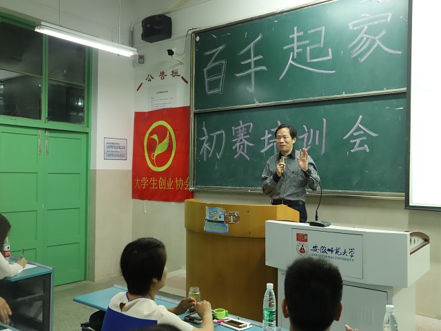 本网讯(新闻部 张勇)2018年5月4日晚,老员工创业协会“百”手起家营销实战大赛初赛培训会在2030102教室举行。本次培训赛旨在为参加比赛的选手们答疑解惑,邀请了专业老师进行指导,并邀请了上一届比赛的获奖选手为参赛队员进行经验分享,为选手们接下来的比赛奠定基础。
