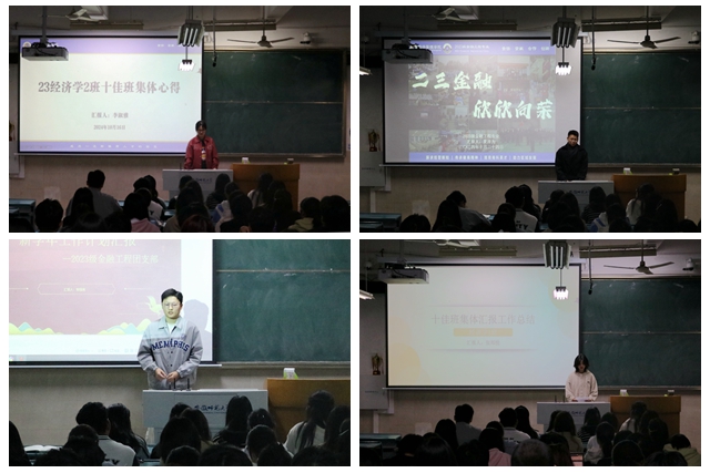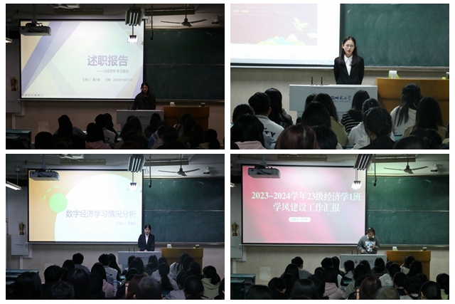 会上,经济金融数经班长、团支书与学习委员依次上台发言。各班班长首先介绍十佳班集体参赛心得,获得十佳班集体的班级汇报经验与改进不足之处,未获得十佳班集体的班级汇报失败原因以及改进措施。团支书汇报本学年的工作计划以及团支部成员安排分工情况。学习委员汇报本学年目前班级学风情况、存在的问题、如何改进措施以及本学年的班级学风建设重点。本学年新任班委进行自我介绍,并阐述自己目前在班级内部分管的工作。