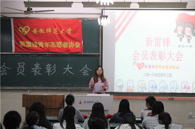 项衔)2018年5月12日晚7点半,新雷锋青年志愿者协会会员表彰大会在行知楼2010503教室成功举办。新雷锋青年志愿者协会会长钟杰,副会长乔微,各部门理事以及协会会员参加了本次活动。