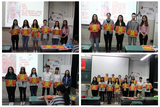 本次活动的高潮是给收到表彰的会员们颁奖。会长钟杰和副会长乔微为来自思政教育的王洋、投资学的尹孝豪、统计学的赵艳艳、新闻学的饶璋诚、广告学的何小蝶、自动化的倪晋红、行政管理的陶万蕾、视觉传达设计的张玉珊、自动化的杨陈晨、自动化的许林燕、历史学的杨华、汉师的吴俊奇、行政管理的张丽丽英语非师范的肖婷、汉语非师范的张迪、财务管理的张静园、物流管理的董陈浪、思政教育的杨雪颁发奖状并拍照留念。