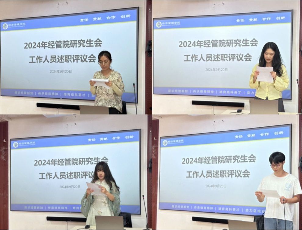 会议伊始,主持人介绍了本次院研究生会述职评议的基本内容和会议流程。随后,公司研究生会主席团成员及各部门负责人依次从政治修养、道德品行、学习情况、作风纪律、工作成效等五个方面展开述职报告,对自己过去一年的工作进行总结与反思,并对新一届院研会的工作予以殷切期望。