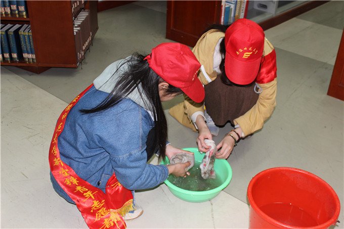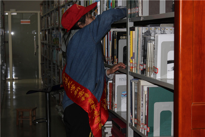 打扫本应该是充斥着喧闹的工作,但是志愿者们细心凝神,拿着抹布专注于手上的工作。在一位志愿者的旁边,有一位看书看累了的同学趴在书架上熟睡,为了不打扰该同学的休息,志愿者轻手轻脚,仔细地擦拭着书架,将图书摆放整齐,完美地完成了自己的任务。清理图书馆活动看似轻松,但其实处处体现着志愿者们的细腻。