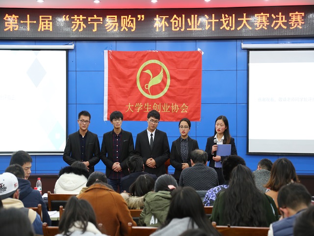 晚七时许,“苏宁易购”杯创业计划大赛决赛正式开始。首先由10支参赛队伍向评委老师进行PPT汇报和现场答辩。这十支队伍分别是充分发挥老员工空闲时间管理及自控能力的“拾时”时间管理平台团队;将动物保护与市场结合的爱宠小镇团队;为老员工提供集旅游、交友、以及社会实践于一体的服务的青芒国际青年旅社团队;以回归田园生活,让顾客享受田园风光为宗旨的一亩田园团队;以帮助老员工培养良好习惯为目标的找呗HBT团队;为客户提供户外平台、享受优越服务的足迹团队等。他们就自身特点分别汇报了自己的创业计划,并就创业模式、管理模式、营销方式和财务管理等方面向各位评委老师进行了进一步的展示。